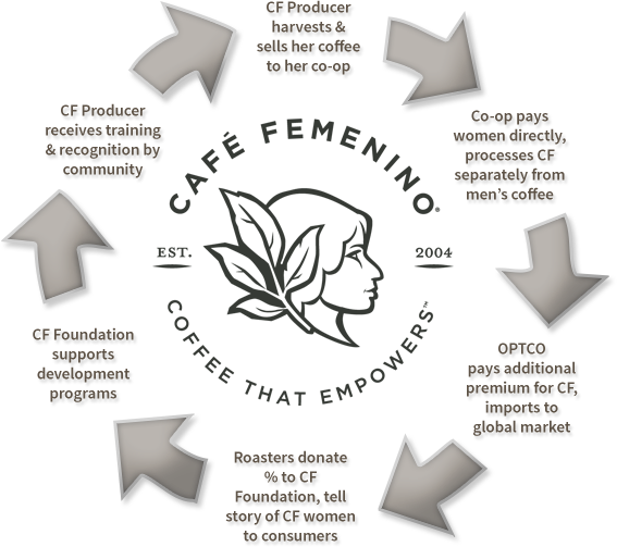 Your morning coffee connects you to millions of women coffee farmers across the world. While these women have always played a vital role in coffee production, they weren’t recognized or directly compensated for their work.In 2004, a few of these women decided to change this by co-founding Café Femenino® alongside Organic Products Trading Company. For the first time, women were recognized as coffee producers and paid for the coffee they produced.Since then, Café Femenino has grown into a movement empowering women in remote coffee-growing regions in nine countries:Bolivia, Colombia, Dominican, Republic, Guatemala, Mexico, Nicaragua, Peru, Rwanda and Sumatra.